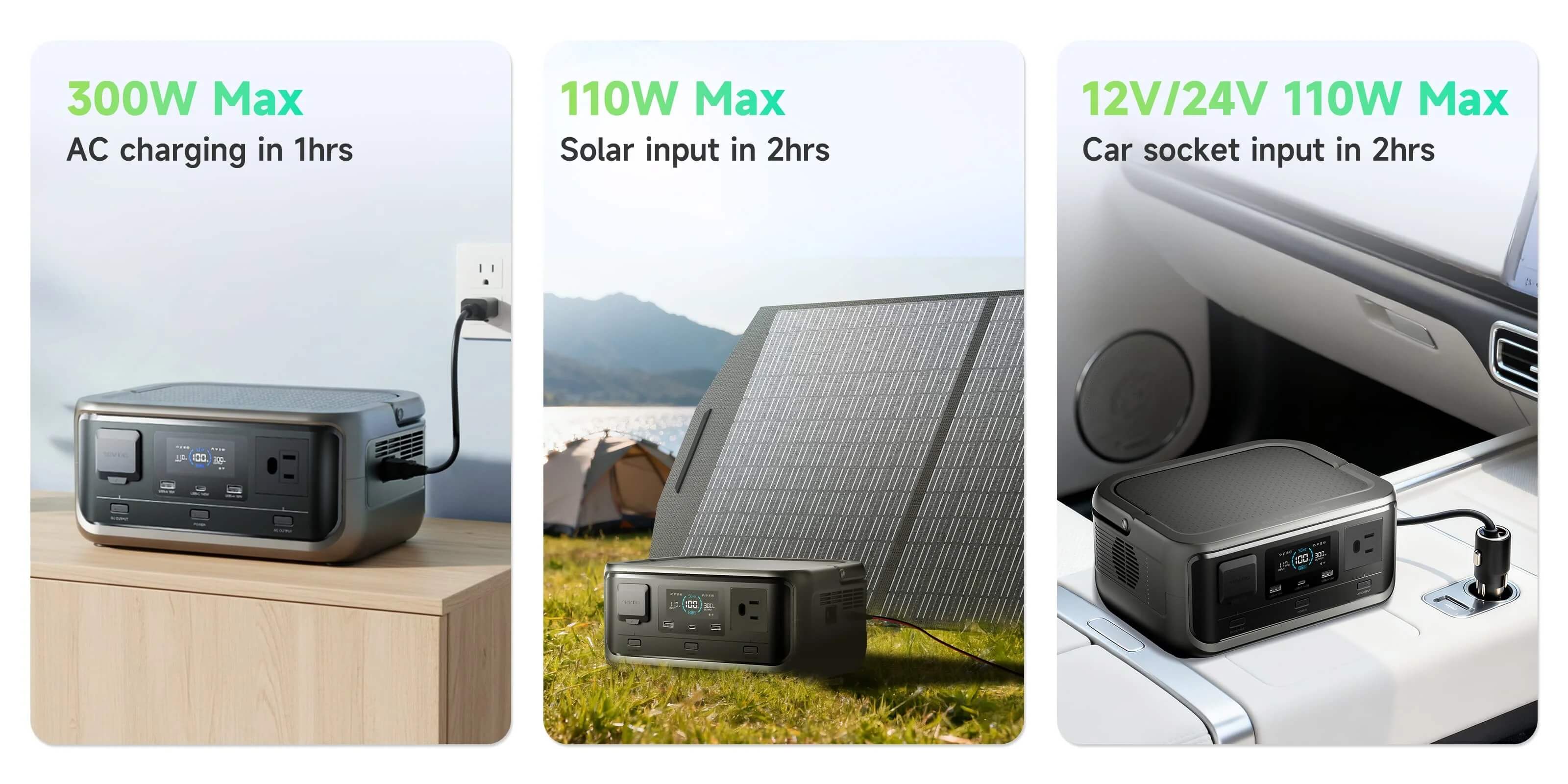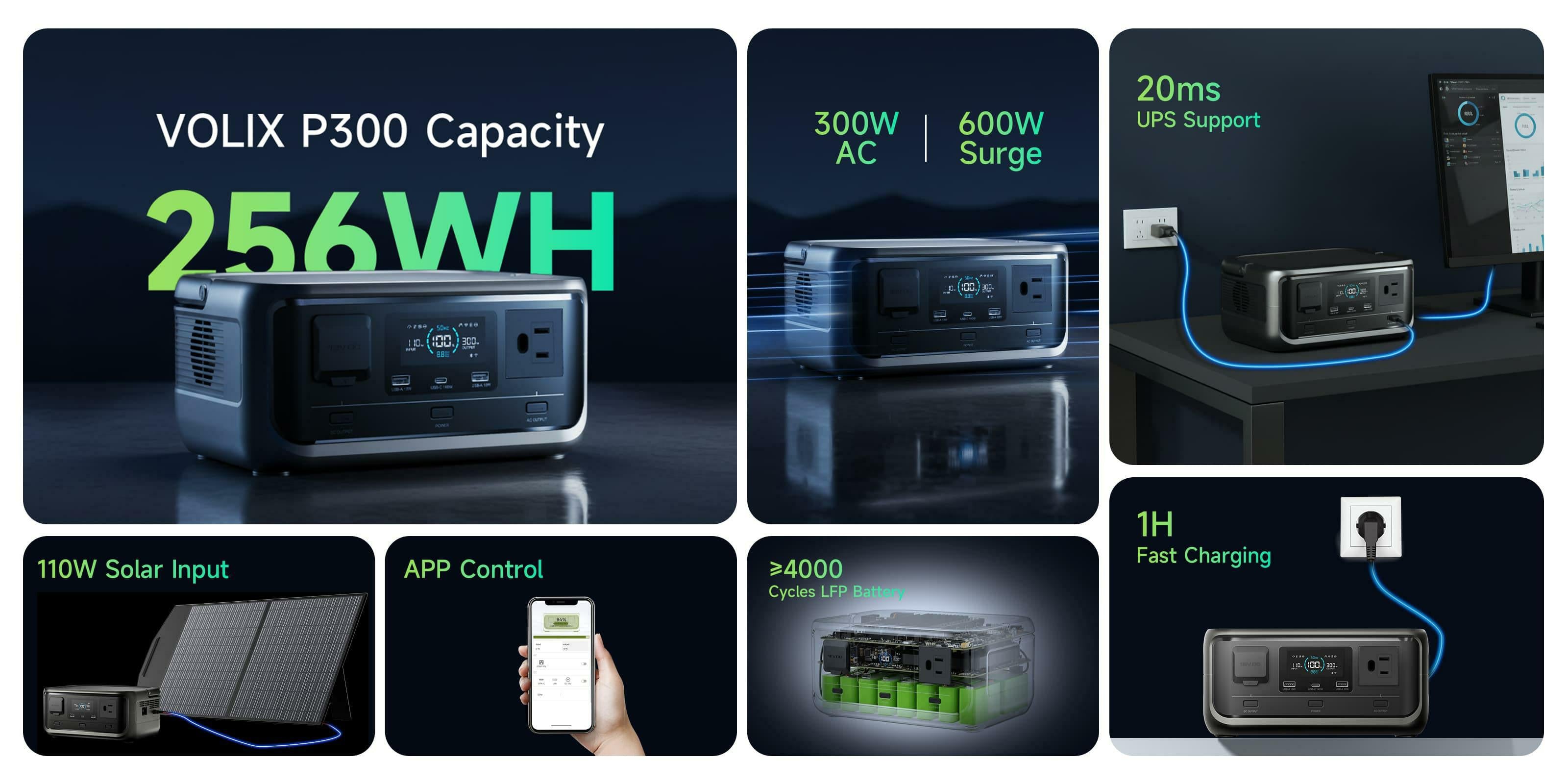 With 300W AC output and 256Wh capacity, the VOLIX P300 powers your devices, small appliances, and more during camping, emergencies, or blackouts. Affordable, portable, and versatile.