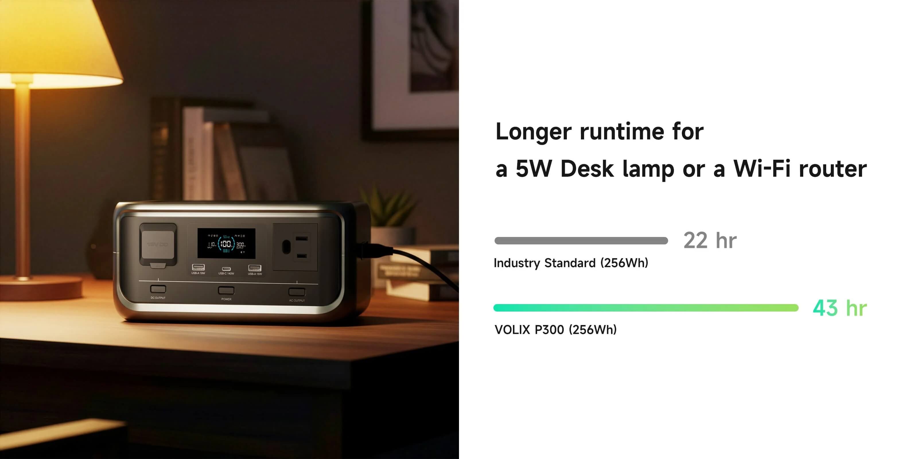 For example, if the VOLIX P300 is used to power a 25W desk lamp, the runtime would be 256Wh * 85% / 25W ≈ 9 hours.