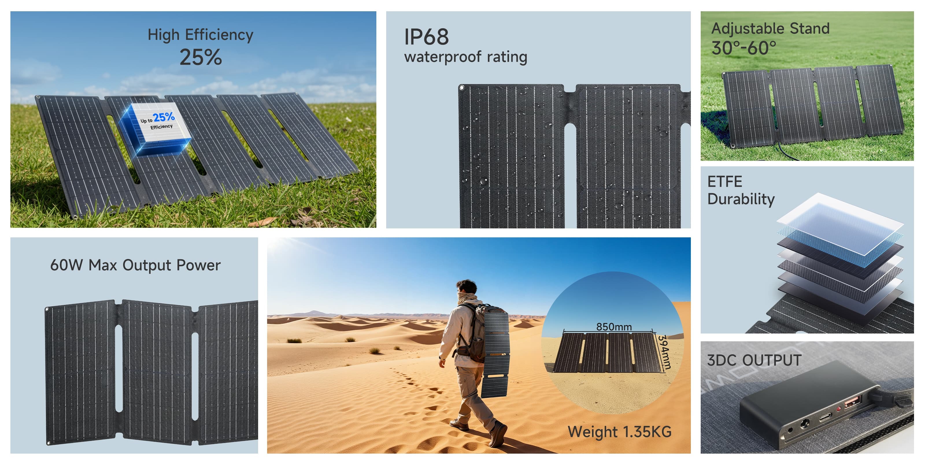 Built for efficient charging on the move, the SE60 is the ideal companion for outdoor adventures. Featuring a lightweight, foldable design, durable ETFE surface, and IP65 splash resistance, it delivers reliable solar power—keeping your devices energized throughout every journey.