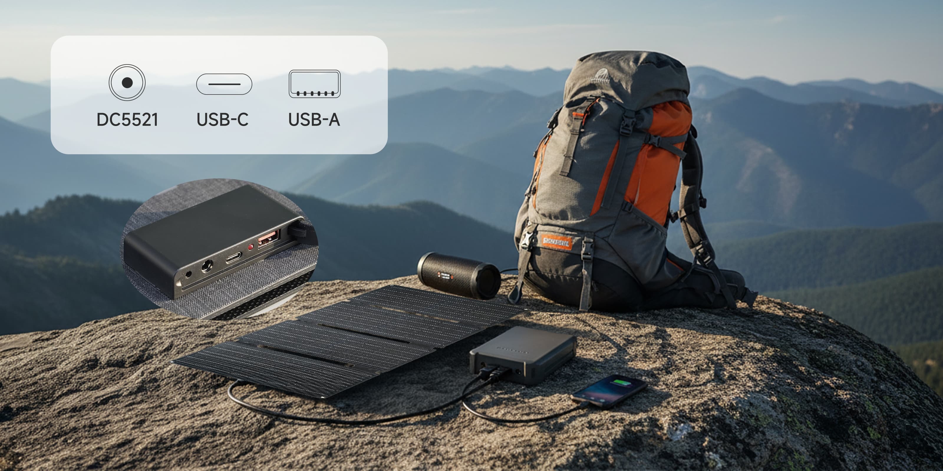 Compatibility Note: The SE60 is compatible with most solar generators on the market via DC output. It also functions as a standalone charger for on-the-go power, allowing you to directly charge your smartphones, tablets, and other devices via the built-in USB-A and USB-C ports. (Please check the power, current, and voltage of the SE60 and ensure it matches the solar input parameters required by your power station).